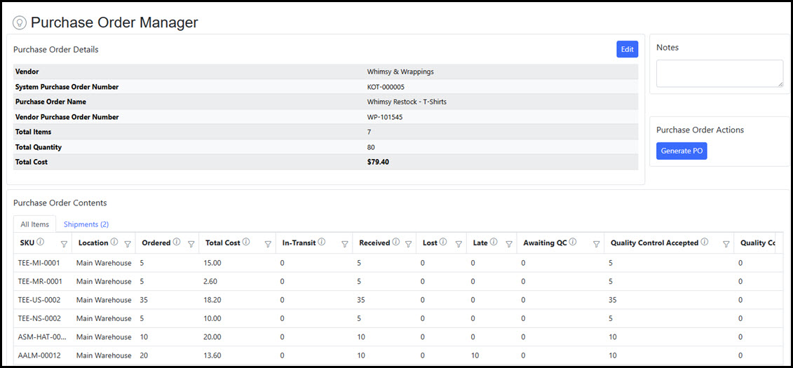 Viewing a closed Purchase Order takes the user to an uneditable version of the Purchase Order Manager for the closed purchase order. All details and shipment information can be viewed. Additional information regarding closed purchase orders can be made available via the reporting tool.