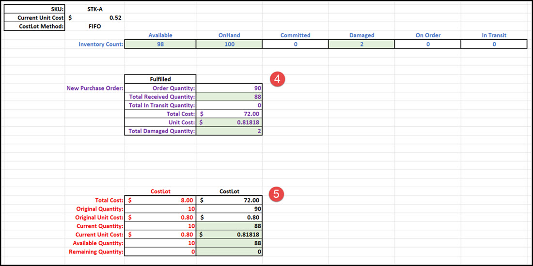 So, in the example below, the order of 20 items has fully depleted the earliest Cost Lot of 10 and reduced the next Cost Lot by the remaining 10 items.