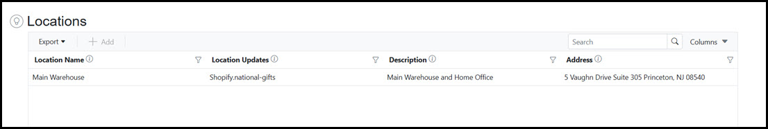 The Locations Grid provides visibility and access to all Locations currently in Skuttlefish. The Locations Grid allows for searching, filtering, and sorting of contents as well as the ability export to Excel or PDF file formats. Locations in Skuttlefish are populated and updated via the associated Shopify Channel that is set for the Location.