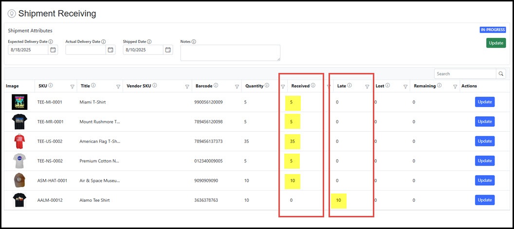 - Item Progress: The progress of the items in the shipment. Tracks the expected amount in the shipment, received amount, any counts flagged as late or lost, and any remaining that has not been processed.