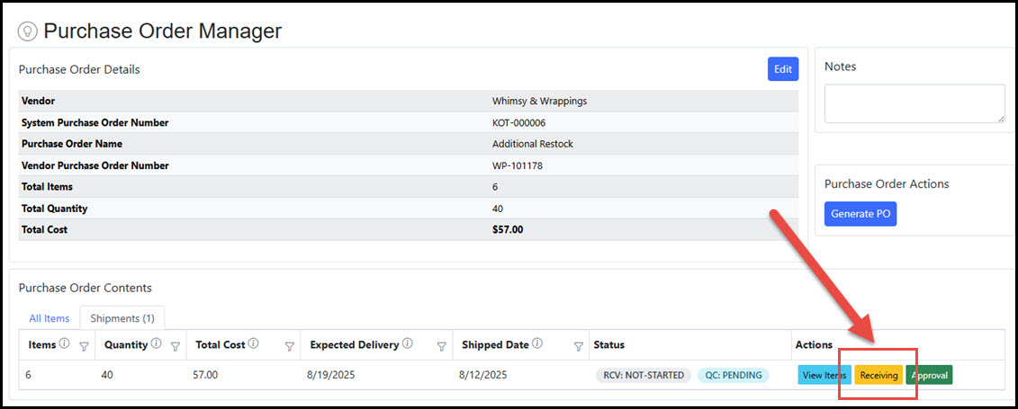 The Purchase Order Manager also shows a Receiving button on every shipment record; when the shipment is In-Transit, it links straight to the Shipment Receiving record.