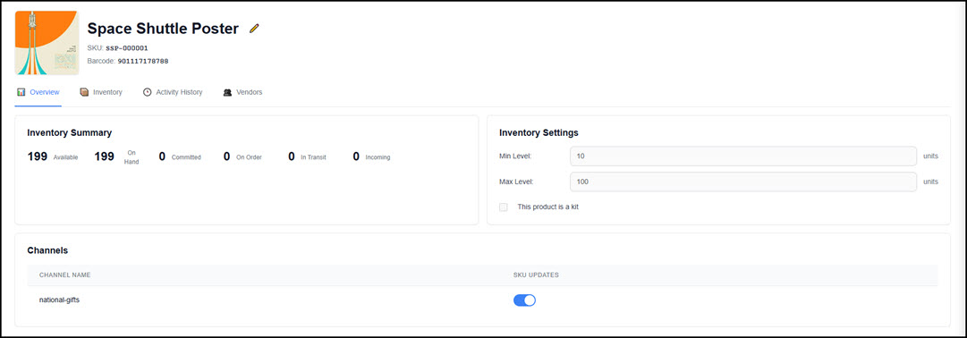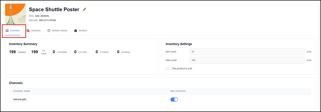 The SKU View includes the details of the product displayed in several tabs on the screen. The Overview displays the current total stock counts, basic minimum and maximum carry threshold settings, and the respective channel.
