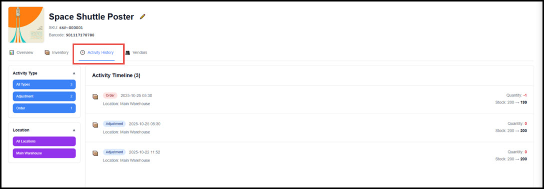 The Activity History displays the timeline of adjustments that have impacted the product inventory counts. These can be adjustments in Skuttlefish or via Shopify. Filter by activity type or location using the left panel.