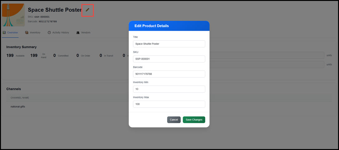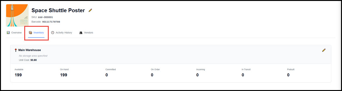 The Inventory tab shows the invnetory counts by Location (only one location is currently supported). Click the pencil to update the unit cost or storage location for the product.