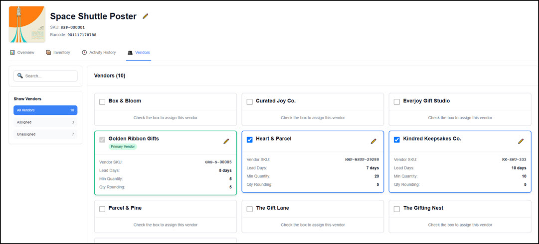 Each SKU can be linked to one or more Vendors, allowing for detailed purchase order configuration and vendor-specific item tracking. One vendor may be tagged as the primary vendor for a product. For each Vendor-SKU relationship, the following attributes are tracked: