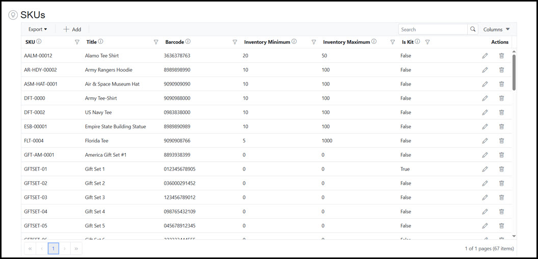 The SKUs Grid provides visibility and access to all SKUs currently in Skuttlefish. The SKUs Grid allows for searching, filtering, and sorting of contents as well as the ability export to Excel or PDF file formats. Click on a row to view additional SKU details.